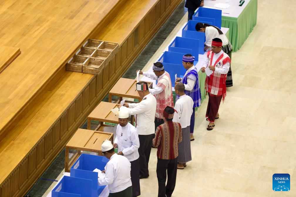 Members of the elected Pyithu Hluttaw representatives' group vote to elect a vice president during the second day meeting in Nay Pyi Taw, Myanmar, March 31, 2026. U Nyo Saw was elected vice president by the group of military representatives from both houses of Myanmar's Union Parliament on Tuesday, according to the Information Team of the National Defense and Security Council.