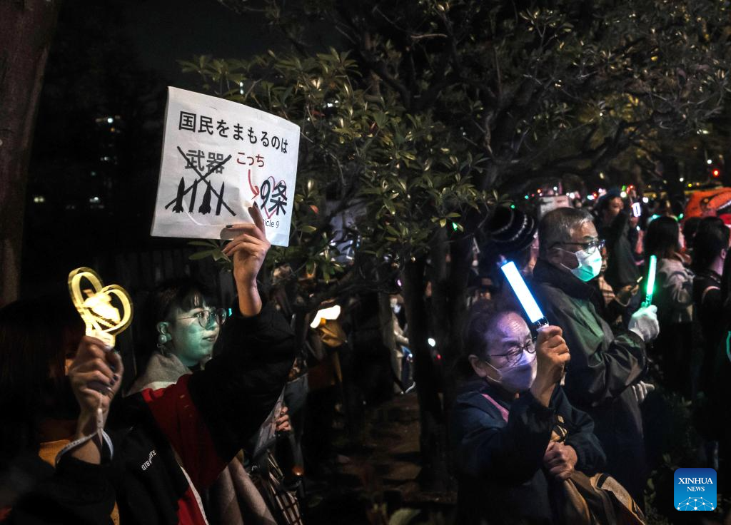 TOKYO, April 9 (Xinhua) -- A large crowd of Japanese people gathered outside the parliament building in Tokyo on Wednesday evening to protest government moves that undermine the country's pacifist constitution, including the deployment of long-range missiles and attempts to ease restrictions on lethal arms exports.