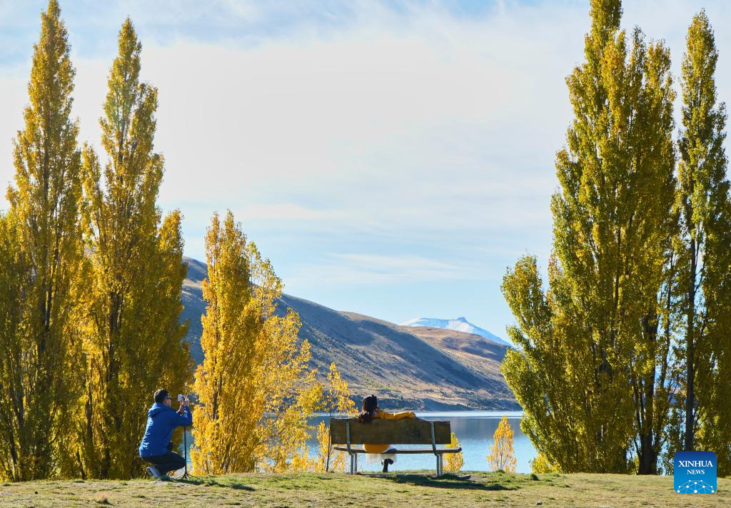 Tourists take photos while enjoying autumn scenery by Lake Tekapo of New Zealand's South Island on April 23, 2026. (Photo by Chen Siyumeng/Xinhua)
