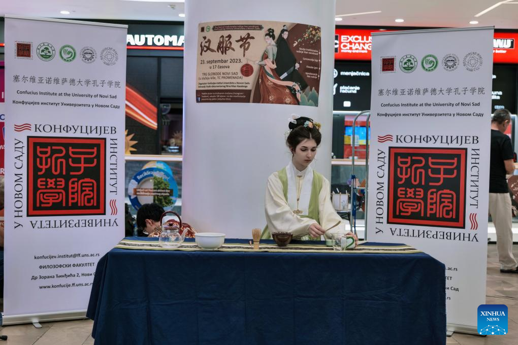 A Serbian student shows Chinese tea ceremony during a Chinese culture event in the north-central Serbian city of Novi Sad, Sept. 23, 2023. This cultural event was hosted on Saturday by the Confucius Institute at the University of Novi Sad, attracting many local citizens. (Confucius Institute at the University of Novi Sad/Handout via Xinhua)