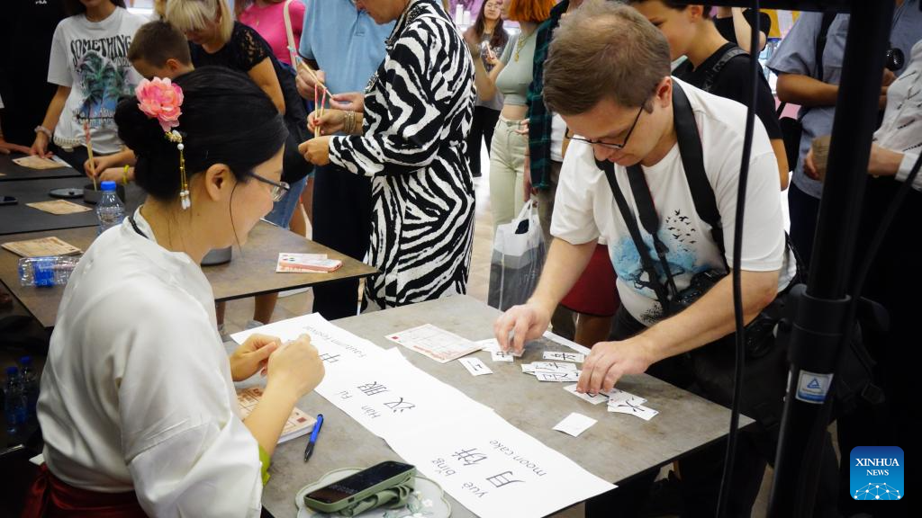 A Serbian citizen plays a game of Chinese phonics during a Chinese culture event in the north-central Serbian city of Novi Sad, Sept. 23, 2023. This cultural event was hosted on Saturday by the Confucius Institute at the University of Novi Sad, attracting many local citizens. (Confucius Institute at the University of Novi Sad/Handout via Xinhua)