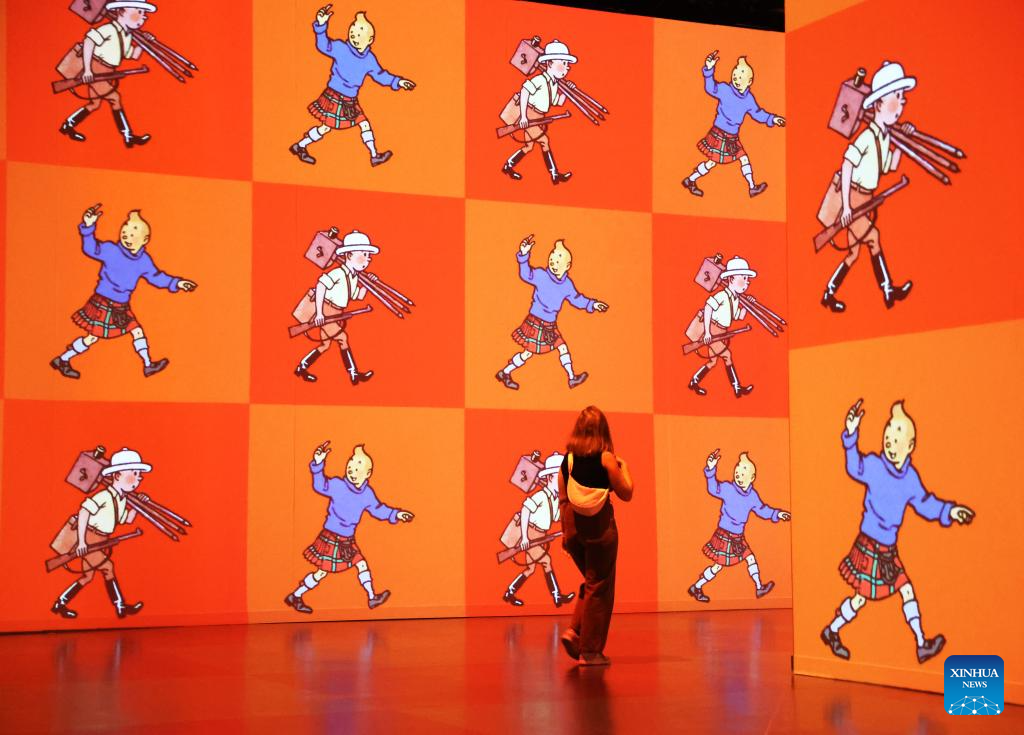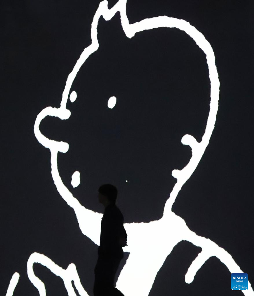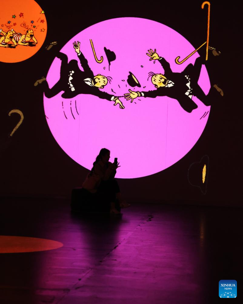 A man visits an exhibition based on the comic series "The Adventures of Tintin" in Brussels, Belgium, Sept. 27, 2023. Extending over a 1,600-square-meter projection surface, the digital exhibition enabled visitors to immerse themselves in the world of Tintin. (Xinhua/Zhao Dingzhe)