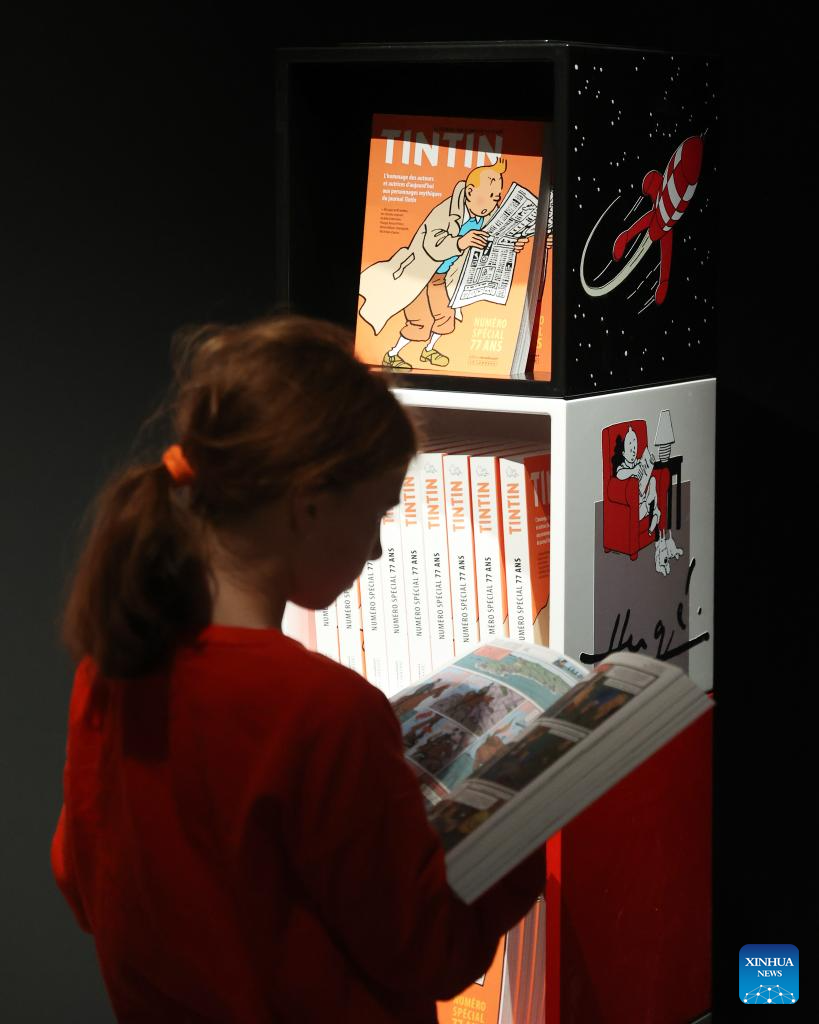 A girl reads a book at an exhibition based on the comic series "The Adventures of Tintin" in Brussels, Belgium, Sept. 27, 2023. Extending over a 1,600-square-meter projection surface, the digital exhibition enabled visitors to immerse themselves in the world of Tintin. (Xinhua/Zhao Dingzhe)