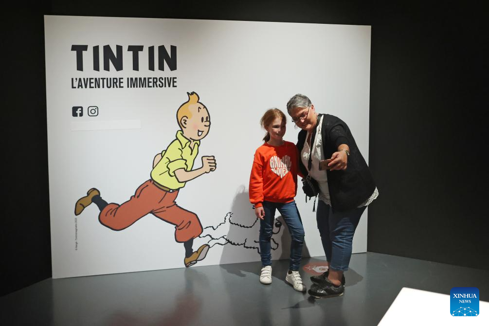 People pose for a selfie at an exhibition based on the comic series "The Adventures of Tintin" in Brussels, Belgium, Sept. 27, 2023. Extending over a 1,600-square-meter projection surface, the digital exhibition enabled visitors to immerse themselves in the world of Tintin. (Xinhua/Zhao Dingzhe)