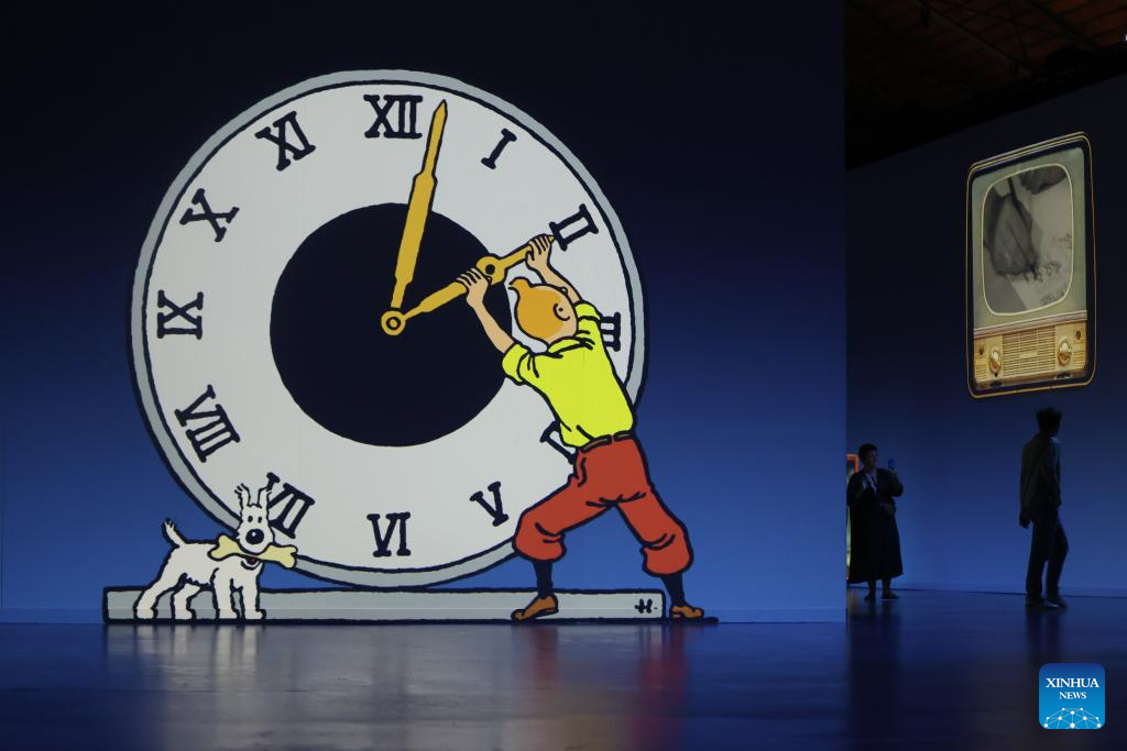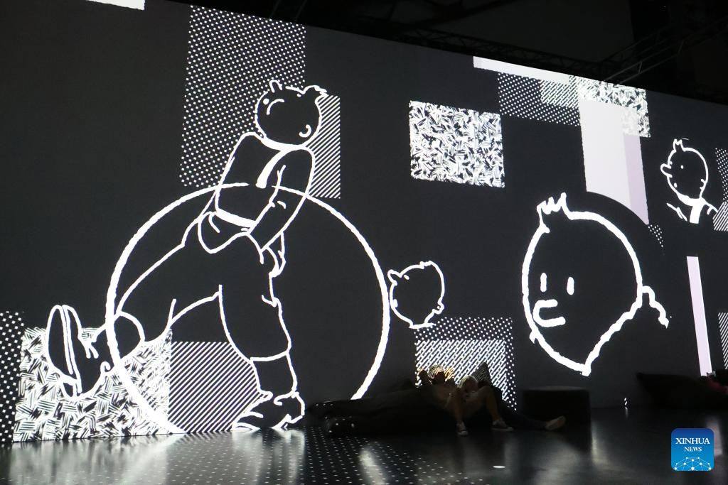People visit an exhibition based on the comic series "The Adventures of Tintin" in Brussels, Belgium, Sept. 27, 2023. Extending over a 1,600-square-meter projection surface, the digital exhibition enabled visitors to immerse themselves in the world of Tintin. (Xinhua/Zhao Dingzhe)