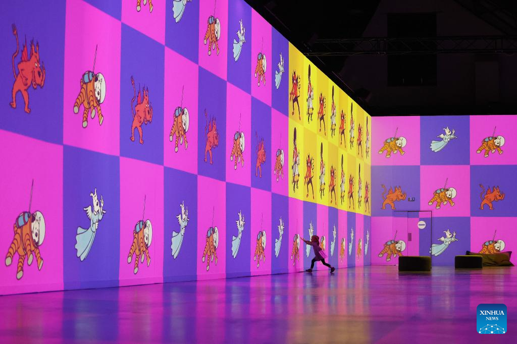 A girl amuses herself at an exhibition based on the comic series "The Adventures of Tintin" in Brussels, Belgium, Sept. 27, 2023. Extending over a 1,600-square-meter projection surface, the digital exhibition enabled visitors to immerse themselves in the world of Tintin. (Xinhua/Zhao Dingzhe)