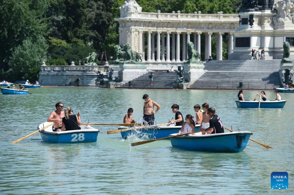 People row boats at a garden in Madrid, Spain, Aug. 4, 2025. Heatstroke alerts were issued in many places across Spain as the country is hit by a searing heatwave. (Photo by Gustavo Valiente/Xinhua)