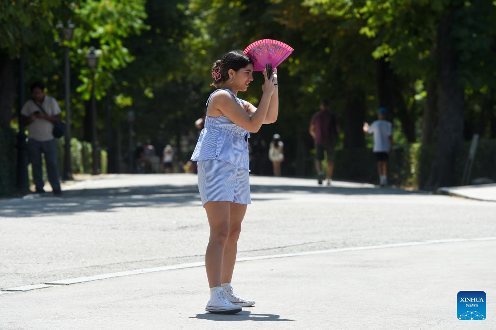 A woman uses a fan to shield herself from the sun at a garden in Madrid, Spain, Aug. 4, 2025. Heatstroke alerts were issued in many places across Spain as the country is hit by a searing heatwave. (Photo by Gustavo Valiente/Xinhua)