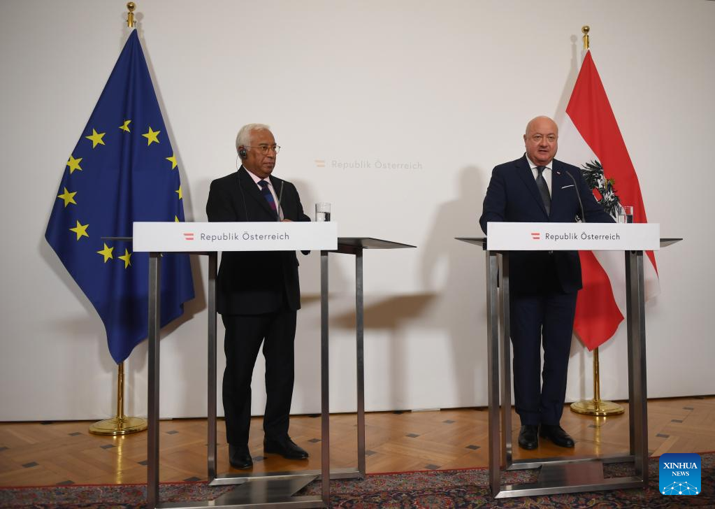 European Council President Antonio Costa (L) and Austrian Chancellor Christian Stocker attend a press conference in Vienna, Austria, Sept. 3, 2025. (Xinhua/He Canling)