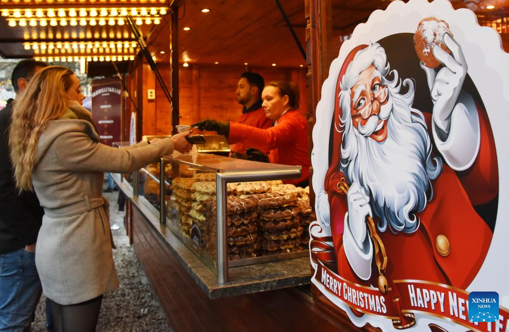 A woman buys food at the Royal Christmas Fair in The Hague, the Netherlands, Dec. 6, 2025. Kicking off here on Dec. 4, the fair will run until Dec. 23. (Xinhua/Shao Haijun)