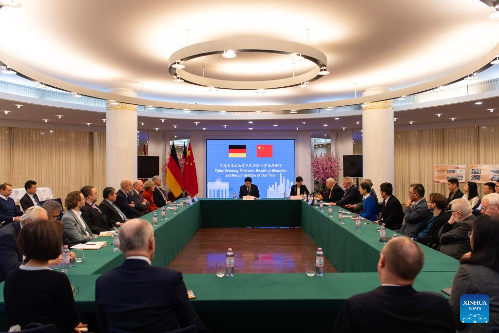 This photo taken on Dec. 12, 2025 shows a symposium on China-Germany relations in Berlin, Germany. Chinese ambassador to Germany Deng Hongbo has called on China and Germany to deepen mutual trust and jointly write a new chapter of friendship. The symposium was held here on Friday by the Chinese Embassy in Germany. (Xinhua/Zhang Haofu)