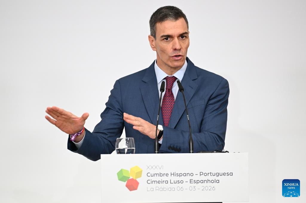 Spanish Prime Minster Pedro Sanchez speaks during a press conference following the Spain-Portugal summit in La Rabida, Huelva, Spain, March 6, 2026. Spanish Prime Minster Pedro Sanchez said on Friday that the U.S.-Israeli military action against Iran is an "extraordinary mistake" and rejected criticism from U.S. President Donald Trump for Spain's refusal to allow the U.S. to use its bases in the country in the ongoing aerial assault. (La Moncloa/Handout via Xinhua)