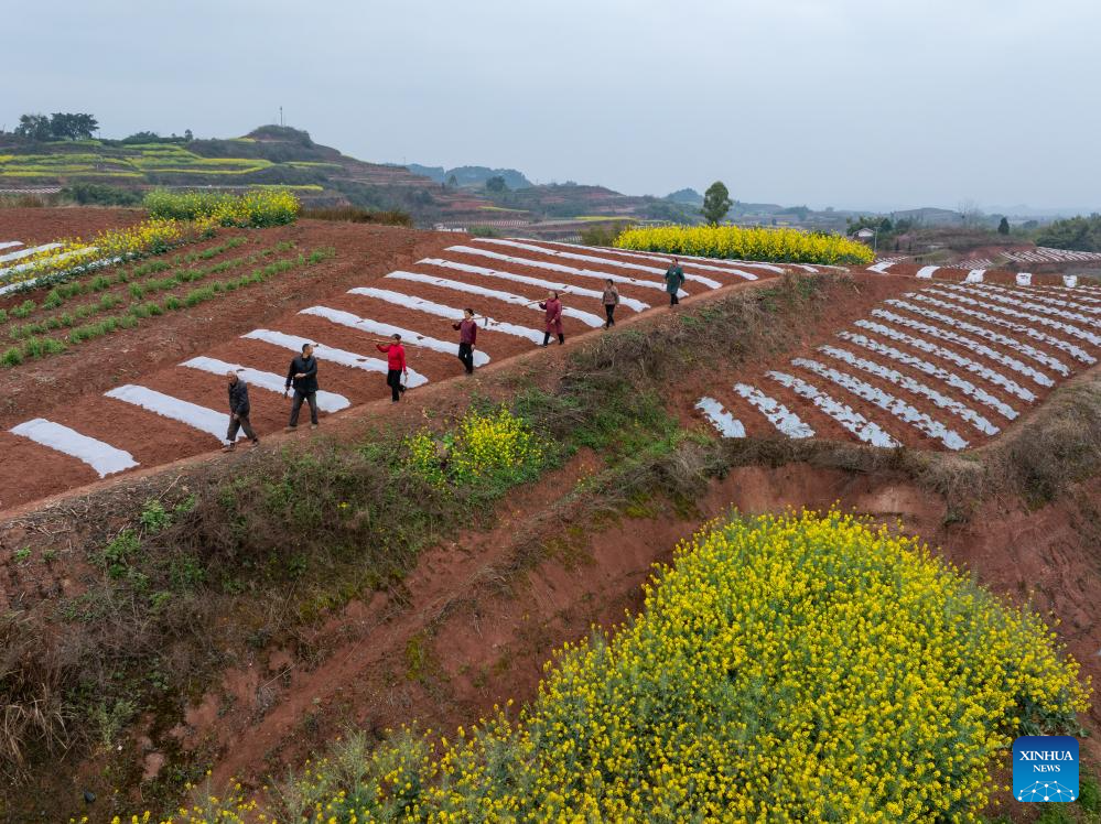 Farmers work in a field in Tiangongmiao Village, Lede Town, Rongxian County of southwest China's Sichuan Province, March 6, 2026. (Xinhua/Jiang Hongjing)