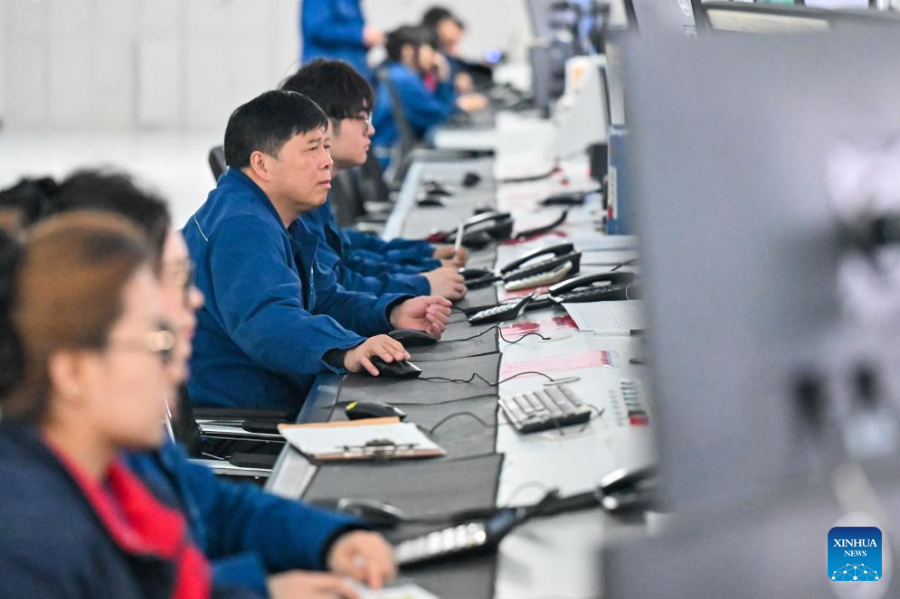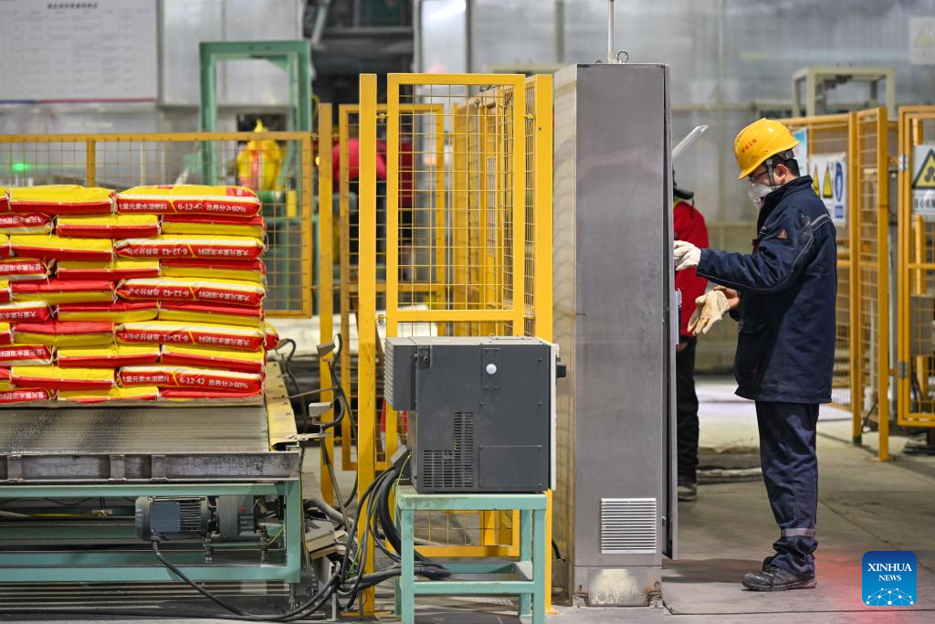 Employees monitor facility operation at a fertilizer company in Manas County of Changji Hui Autonomous Prefecture, northwest China's Xinjiang Uygur Autonomous Region, on March 5, 2026. Agricultural supply manufacturers in Xinjiang are working at full capacity to fulfill orders and ensure a steady flow of fertilizers and materials for spring farming.