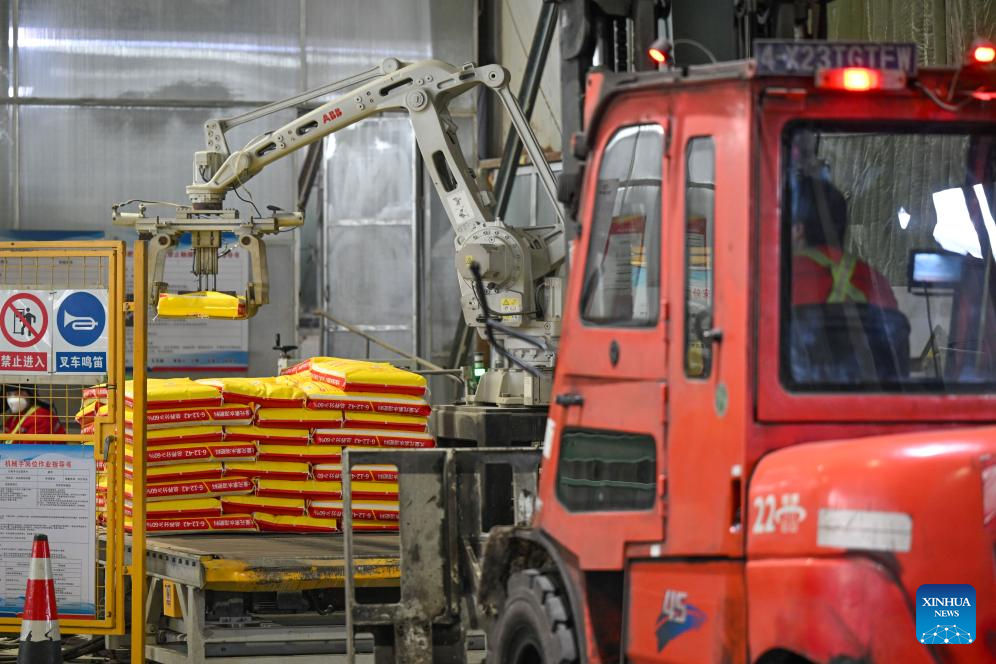 An automatic palletizing robot works on the production line at a fertilizer company in Manas County of Changji Hui Autonomous Prefecture, northwest China's Xinjiang Uygur Autonomous Region, on March 4, 2026. Agricultural supply manufacturers in Xinjiang are working at full capacity to fulfill orders and ensure a steady flow of fertilizers and materials for spring farming.
