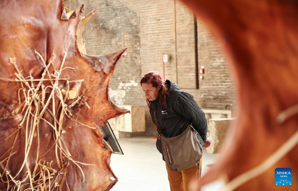 A visitor watches the exhibition "Metamorphosis" in Baths of Diocletian of the National Roman Museum in Rome, Italy, April 1, 2026. The exhibition presents the contemporary Chinese artist Wu Jian'an's reflection on the theme of transformation through a dialogue between Eastern and Western traditions. (Xinhua/Wang Kaiyan)
