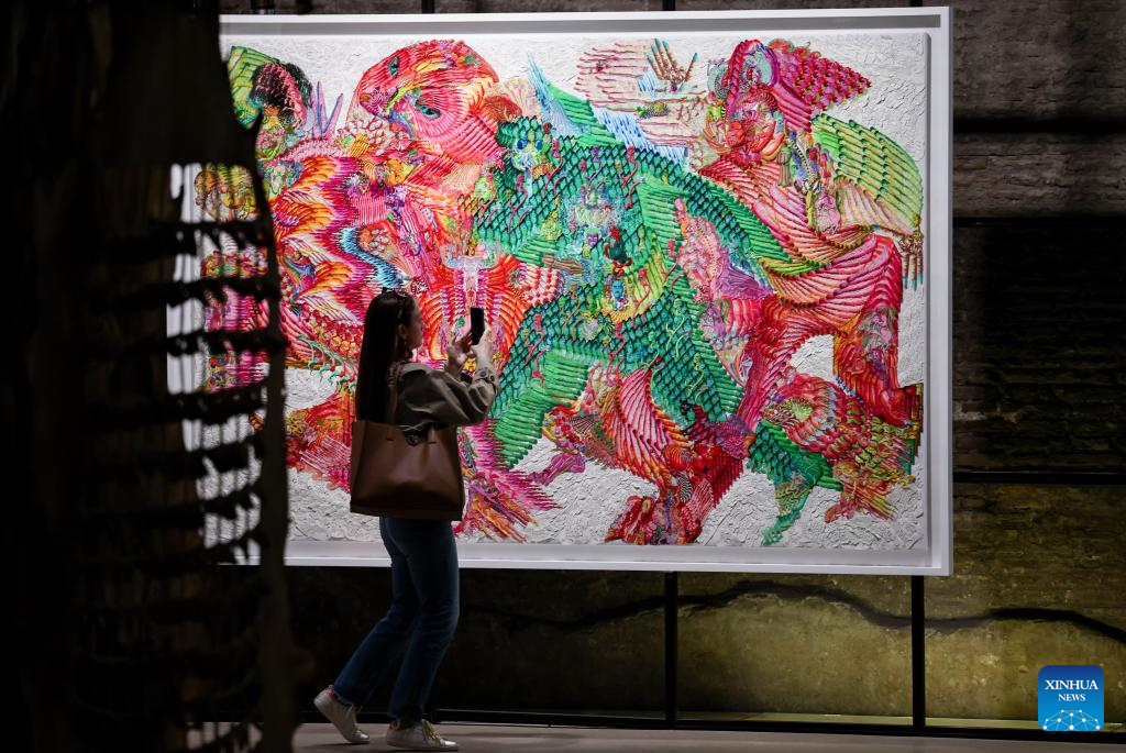 A visitor takes photos of an artwork at the exhibition "Metamorphosis" in Baths of Diocletian of the National Roman Museum in Rome, Italy, April 1, 2026. The exhibition presents the contemporary Chinese artist Wu Jian'an's reflection on the theme of transformation through a dialogue between Eastern and Western traditions. (Xinhua/Wang Kaiyan)