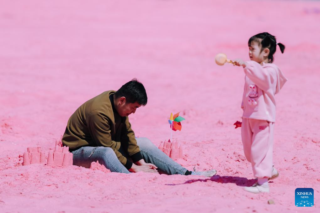 Family members play on a pink artificial beach at a park in Changchun, northeast China's Jilin Province, April 26, 2026. This year, many young Chinese have added a new ritual to that tradition, the "color walk".