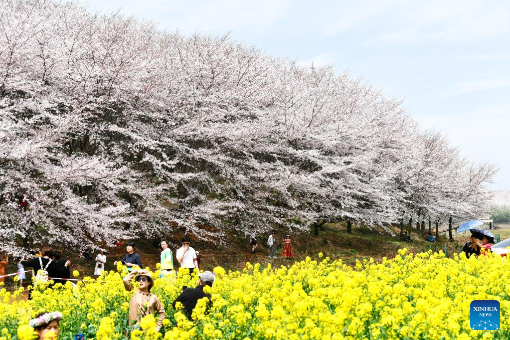 Tourists visit a cherry garden in Guian New Area, southwest China's Guizhou Province, March 21, 2023. A cherry garden of the Guian New Area, covering an area of 24,000 mu (about 1,600 hectares), has attracted a large flow of tourists during the blooming season of cherry blossoms. (Xinhua/Yang Wenbin)