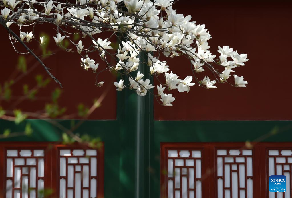 This photo taken on March 25, 2023 shows magnolia flowers in full bloom at Beihai Park in Beijing, capital of China. With spring in the air, many people go out to enjoy various blooming flowers in Beijing. (Xinhua/Luo Xiaoguang)
