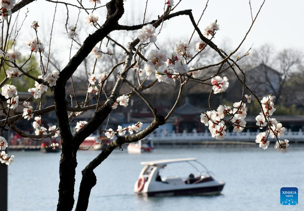 This photo taken on March 25, 2023 shows peach blossoms near Shichahai scenic area in Beijing, capital of China. With spring in the air, many people go out to enjoy various blooming flowers in Beijing. (Xinhua/Luo Xiaoguang)