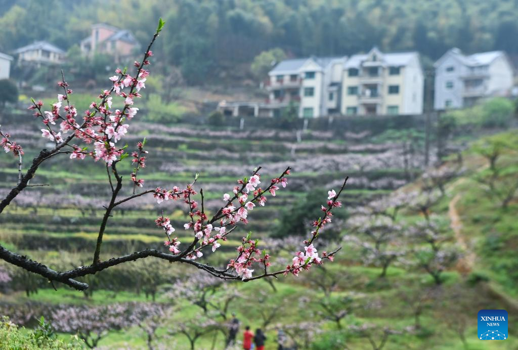 This photo taken on March 25, 2023 shows peach blossoms in Banshan Village of Xindeng Township, Hangzhou, east China's Zhejiang Province. (Xinhua/Xu Yu)