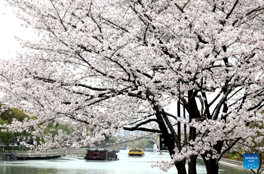 This photo taken on March 25, 2023 shows people enjoying cherry blossoms from tourist boats in Suzhou, east China's Jiangsu Province. People go on outings to enjoy the scenery of flowers in bloom as the temperature rises in spring. (Xinhua/Hang Xingwei)