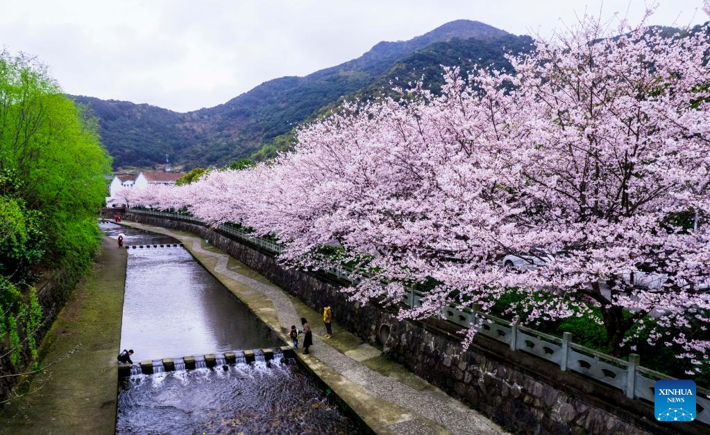 This aerial photo taken on March 25, 2023 shows tourists enjoying cherry blossoms in Hege Village of Beilun District in Ningbo, east China's Zhejiang Province. People go on outings to enjoy the scenery of flowers in bloom as the temperature rises in spring. (Xinhua/Suo Xianglu)