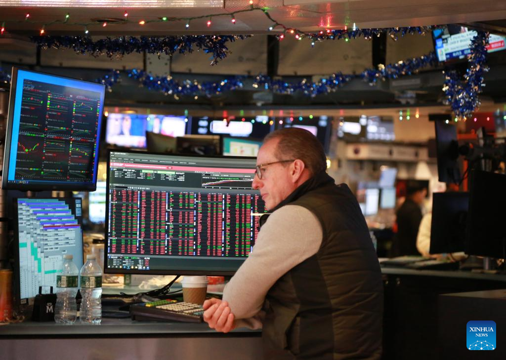 A trader works on the floor of the New York Stock Exchange in New York, the United States, on Dec. 12, 2025. U.S. stocks ended lower on Friday. The Dow Jones Industrial Average fell by 245.96 points, or 0.51 percent, to 48,458.05. The S&P 500 sank 73.59 points, or 1.07 percent, to 6,827.41. The Nasdaq Composite Index shed 398.69 points, or 1.69 percent, to 23,195.17. (Xinhua/Liu Yanan)