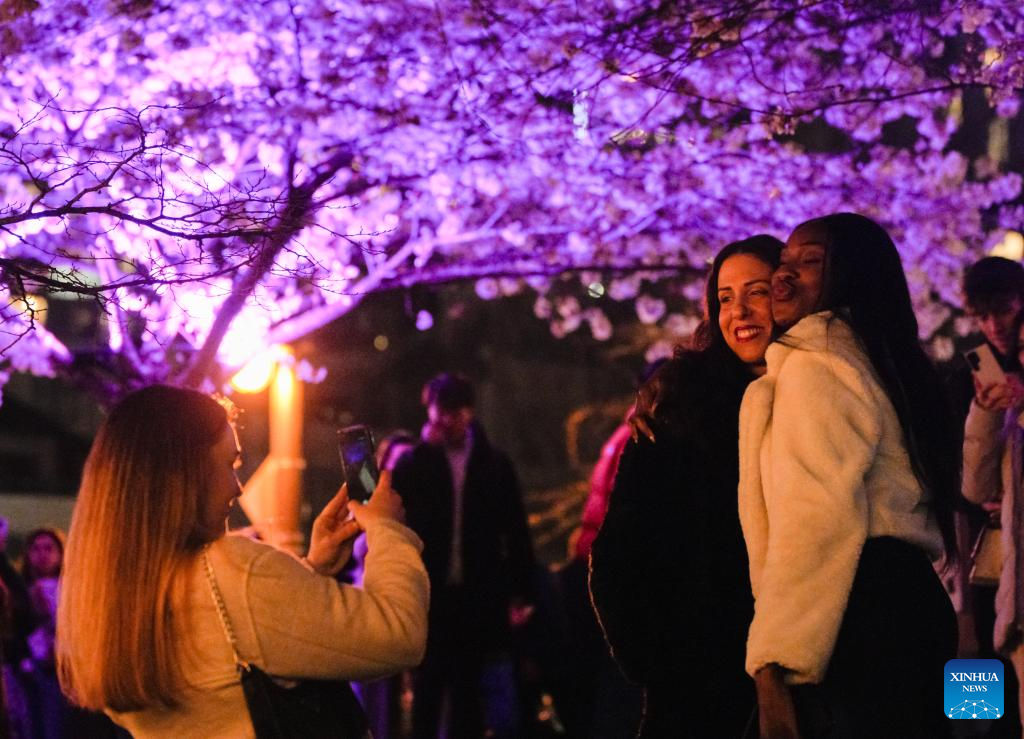 Visitors take photos under illuminated cherry blossom trees during the Blossoms After Dark event at David Lam Park in Vancouver, British Columbia, Canada, on March 27, 2026. The two-night free outdoor event features illuminated cherry blossoms, performances, food vendors and interactive activities. (Photo by Liang Sen/Xinhua)