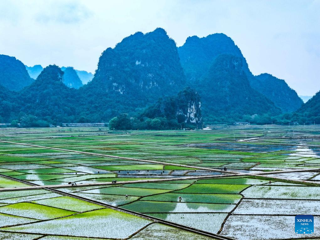 A drone photo taken on March 29, 2026 shows farmers working in fields in Matang Village of Xingye County, Yulin City in south China's Guangxi Zhuang Autonomous Region. (Photo by Liu Zheng/Xinhua)
