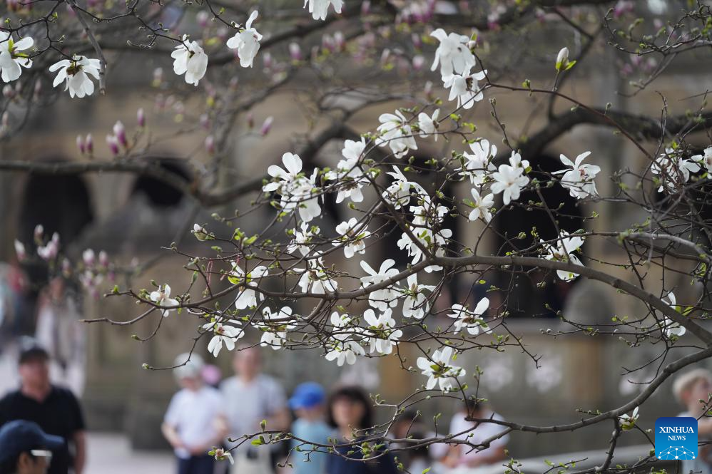 People watch Magnolia flowers at the Central Park in New York, the United States, on April 1, 2026. (Xinhua/Zhang Fengguo)