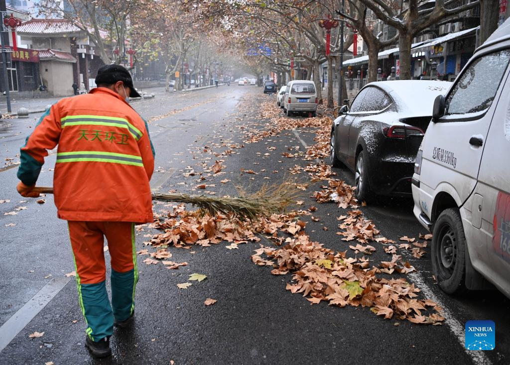 A sanitation worker cleans the road in Xi'an, northwest China's Shaanxi Province, Dec. 25, 2021. Xi'an imposed closed-off management for communities and villages on Thursday in an effort to curb the spread of the latest COVID-19 resurgence. More than 3,000 nucleic acid testing sites in Xi'an are working simultaneously to provide services for residents in communities and on roadsides. Tens of thousands of frontline workers and volunteers are working against the clock to contain the virus. To swiftly contain the spread of the virus, local authorities have rolled out urgent measures while ensuring the city's residents have access to daily necessities. (Xinhua/Tao Ming)