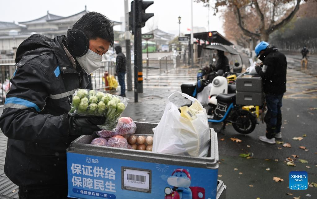 Deliveryman Zhang Xin (1st L) delivers vegetables at a residential area under quarantine in Xi'an, northwest China's Shaanxi Province, Dec. 25, 2021. Xi'an imposed closed-off management for communities and villages on Thursday in an effort to curb the spread of the latest COVID-19 resurgence. More than 3,000 nucleic acid testing sites in Xi'an are working simultaneously to provide services for residents in communities and on roadsides. Tens of thousands of frontline workers and volunteers are working against the clock to contain the virus. To swiftly contain the spread of the virus, local authorities have rolled out urgent measures while ensuring the city's residents have access to daily necessities. (Xinhua/Tao Ming)