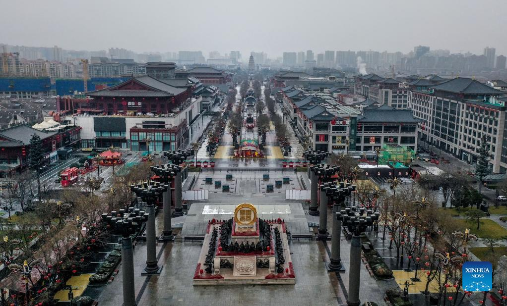 Aerial photo shows a commercial street in Xi'an, northwest China's Shaanxi Province, Dec. 25, 2021. Xi'an imposed closed-off management for communities and villages on Thursday in an effort to curb the spread of the latest COVID-19 resurgence. More than 3,000 nucleic acid testing sites in Xi'an are working simultaneously to provide services for residents in communities and on roadsides. Tens of thousands of frontline workers and volunteers are working against the clock to contain the virus. To swiftly contain the spread of the virus, local authorities have rolled out urgent measures while ensuring the city's residents have access to daily necessities. (Xinhua/Tao Ming)