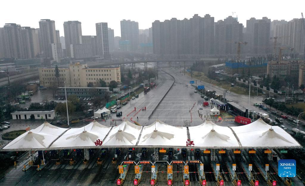 Aerial photo shows a closed toll station in Xi'an, northwest China's Shaanxi Province, Dec. 25, 2021. Xi'an imposed closed-off management for communities and villages on Thursday in an effort to curb the spread of the latest COVID-19 resurgence. More than 3,000 nucleic acid testing sites in Xi'an are working simultaneously to provide services for residents in communities and on roadsides. Tens of thousands of frontline workers and volunteers are working against the clock to contain the virus. To swiftly contain the spread of the virus, local authorities have rolled out urgent measures while ensuring the city's residents have access to daily necessities. (Xinhua/Tao Ming)