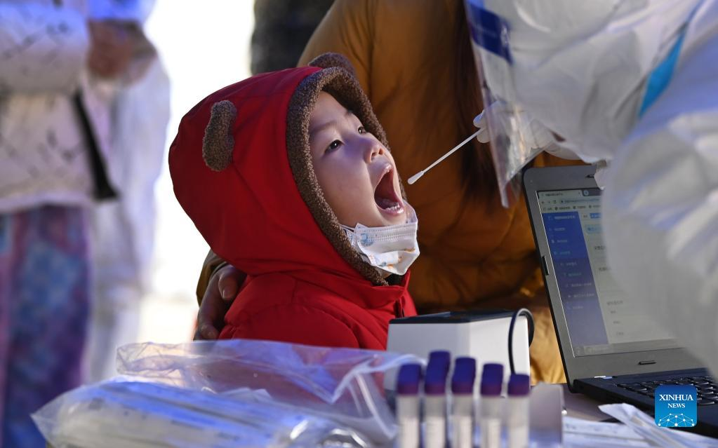 A child receives a nucleic acid test at a testing site in Xi'an, northwest China's Shaanxi Province, Dec. 25, 2021. Xi'an imposed closed-off management for communities and villages on Thursday in an effort to curb the spread of the latest COVID-19 resurgence. More than 3,000 nucleic acid testing sites in Xi'an are working simultaneously to provide services for residents in communities and on roadsides. Tens of thousands of frontline workers and volunteers are working against the clock to contain the virus. To swiftly contain the spread of the virus, local authorities have rolled out urgent measures while ensuring the city's residents have access to daily necessities. (Xinhua/Tao Ming)