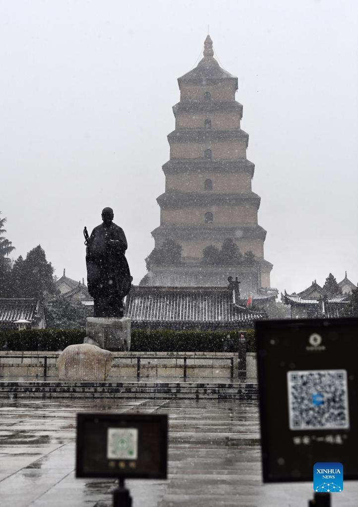 Photo shows an empty square near the Big Wild Goose Pagoda in Xi'an, northwest China's Shaanxi Province, Dec. 25, 2021. Xi'an imposed closed-off management for communities and villages on Thursday in an effort to curb the spread of the latest COVID-19 resurgence. More than 3,000 nucleic acid testing sites in Xi'an are working simultaneously to provide services for residents in communities and on roadsides. Tens of thousands of frontline workers and volunteers are working against the clock to contain the virus. To swiftly contain the spread of the virus, local authorities have rolled out urgent measures while ensuring the city's residents have access to daily necessities. (Xinhua/Tao Ming)