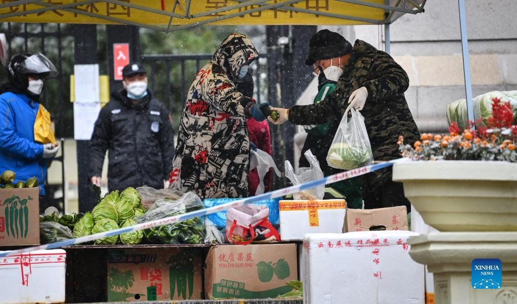 A vegetable market is set up at the entrance of a residential area under quarantine in Xi'an, northwest China's Shaanxi Province, Dec. 25, 2021. Xi'an imposed closed-off management for communities and villages on Thursday in an effort to curb the spread of the latest COVID-19 resurgence. More than 3,000 nucleic acid testing sites in Xi'an are working simultaneously to provide services for residents in communities and on roadsides. Tens of thousands of frontline workers and volunteers are working against the clock to contain the virus. To swiftly contain the spread of the virus, local authorities have rolled out urgent measures while ensuring the city's residents have access to daily necessities. (Xinhua/Tao Ming)