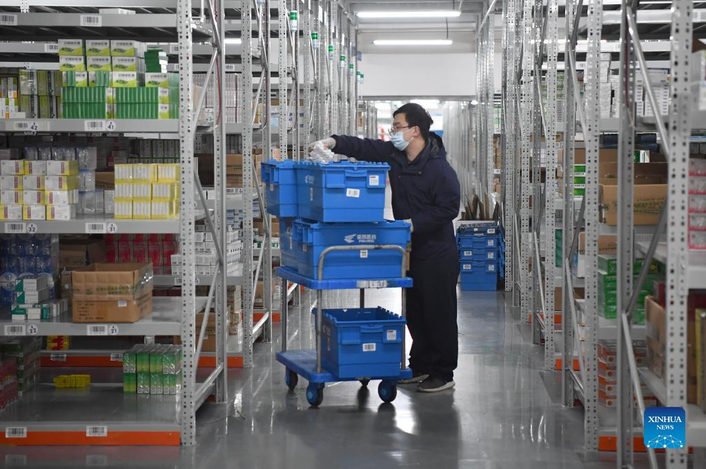 Pharmaceuticals are put in a storage at a pharmaceutical company in Xi'an, northwest China's Shaanxi Province, Dec. 28, 2021. (Xinhua/Shao Rui)