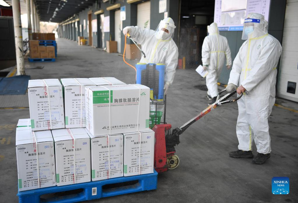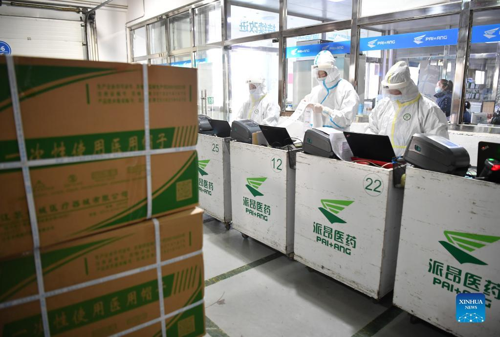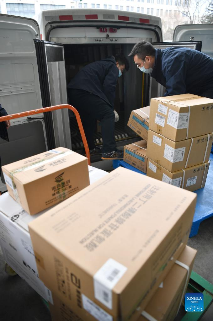 Staff of a pharmaceutical company prepare to deliver pharmaceuticals in Xi'an, northwest China's Shaanxi Province, Dec. 28, 2021. (Xinhua/Shao Rui)