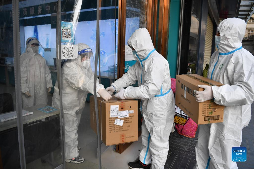 Staff of a pharmaceutical company deliver supplies to a drugstore in Xi'an, northwest China's Shaanxi Province, Dec. 28, 2021. (Xinhua/Shao Rui)