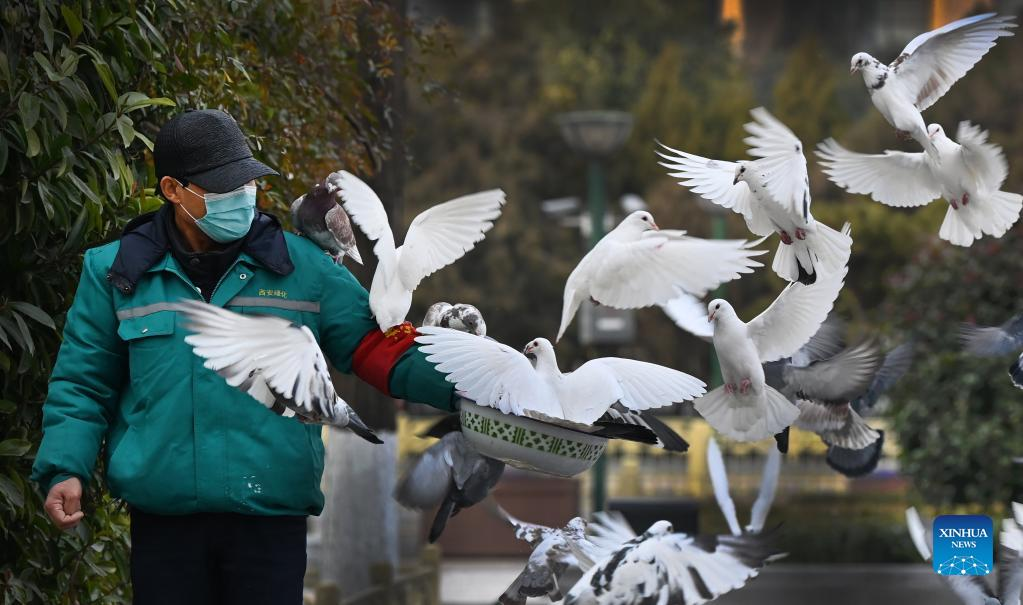 A staff member feeds pigeons at Xincheng Square in Xi'an, northwest China's Shaanxi Province, Dec. 28, 2021. Authorities in Xi'an have upgraded epidemic control and prevention measures starting Monday, ordering all residents to stay indoors and keep away from gatherings except when taking nucleic acid tests. (Xinhua/Tao Ming)