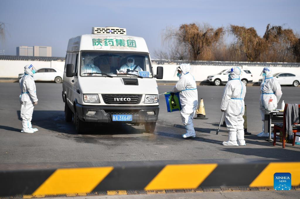 Staff disinfect a transport vehicle entering a pharmaceutical company in Xi'an, northwest China's Shaanxi Province, Dec. 28, 2021. (Xinhua/Shao Rui)