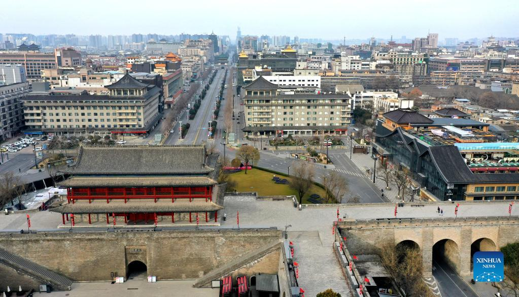 Aerial photo taken on Dec. 28, 2021 shows empty streets near Yongning Gate in Xi'an, northwest China's Shaanxi Province. Authorities in Xi'an have upgraded epidemic control and prevention measures starting Monday, ordering all residents to stay indoors and keep away from gatherings except when taking nucleic acid tests. (Xinhua/Tao Ming)