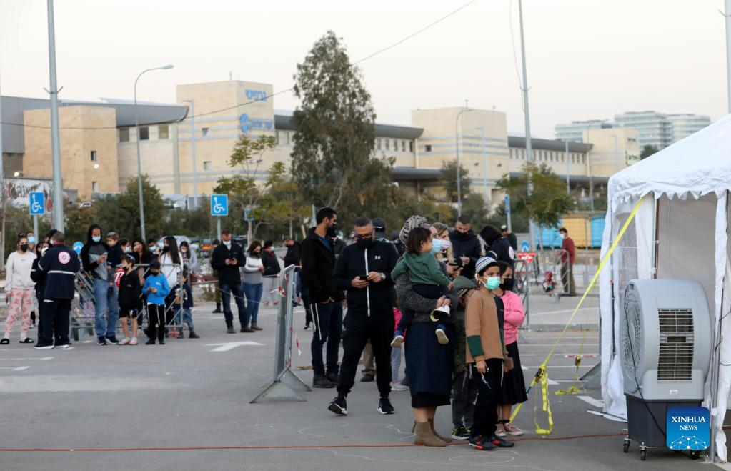 People wait to have COVID-19 rapid antigen tests at a test site in Modiin, central Israel, on Jan. 10, 2022. Israel reported a new daily record of 21,514 COVID-19 cases on Monday, bringing the caseload in the country to 1,519,268, said the Israeli Ministry of Health. (Photo by Gil Cohen Magen/Xinhua)