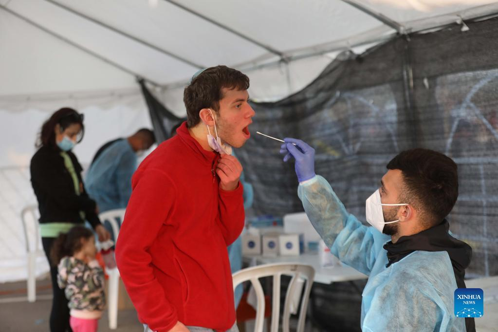 A man has a COVID-19 rapid antigen test at a test site in Modiin, central Israel, on Jan. 10, 2022. Israel reported a new daily record of 21,514 COVID-19 cases on Monday, bringing the caseload in the country to 1,519,268, said the Israeli Ministry of Health. (Photo by Gil Cohen Magen/Xinhua)