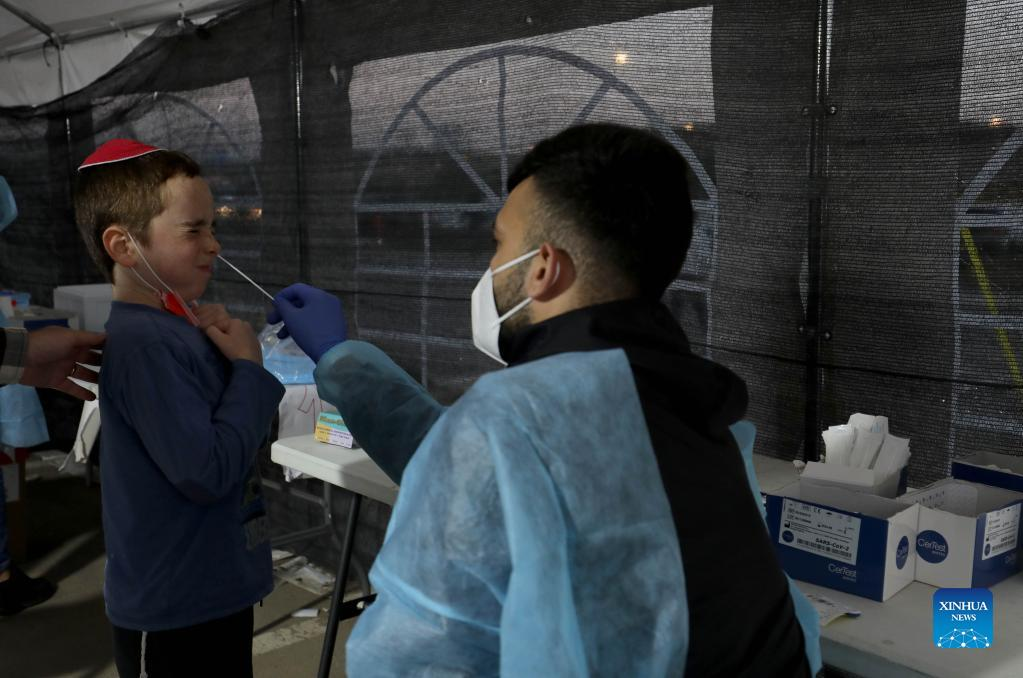 A boy has a COVID-19 rapid antigen test at a test site in Modiin, central Israel, on Jan. 10, 2022. Israel reported a new daily record of 21,514 COVID-19 cases on Monday, bringing the caseload in the country to 1,519,268, said the Israeli Ministry of Health. (Photo by Gil Cohen Magen/Xinhua)