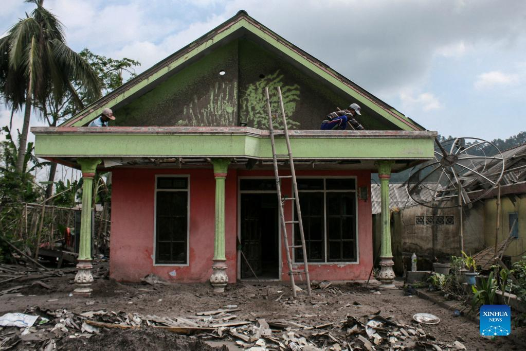 People clean volcanic ash spewed from Mount Semeru on the roof of a house at Curah Kobokan village in Lumajang, East Java, Indonesia, Jan. 9, 2022. (Photo by Kurniawan/Xinhua)