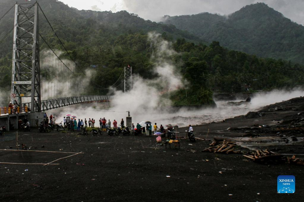 People watch cold lava and white smokes from Mount Semeru at Leprak river in Sumber Wuluh village, Lumajang, East Java, Indonesia, Jan. 9, 2022. (Photo by Kurniawan/Xinhua)